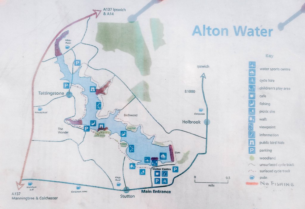 The Alton Water Circular walk is a popular trail near Ipswich, Suffolk. It offers a 16.3-km loop trail. The route is generally considered easy, and it takes an average of 3 hours and 35 minutes to complete. This area is well-known for birding, fishing, and hiking, making it a great destination for outdoor enthusiasts. There is a huge carpark inside the gates, camping options, kids playground, a café and some highland cows. There are plenty of other car parks around the lake, so if you want to start your walks from other points or do half walk you can easily find a space to park, Be aware the car parks are open until 18:00 only! If you feel you arrived around half past 2 afternoon (and the circular walk taking 3,5 hours), worth leaving your car in the village or outside the gates, or you will end up alone in the car park and with no option to leave, barriers will be down and locked after 18:00.