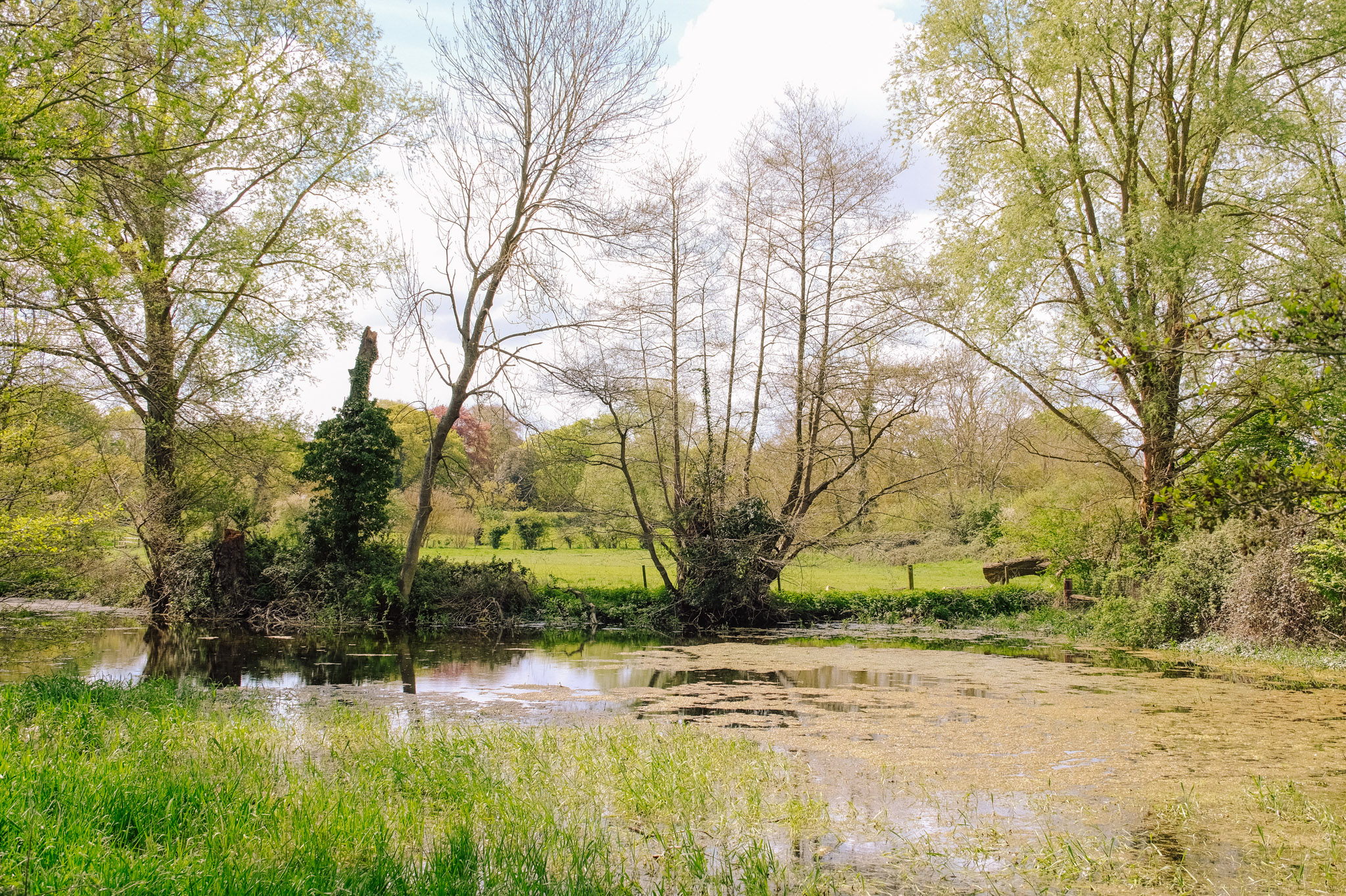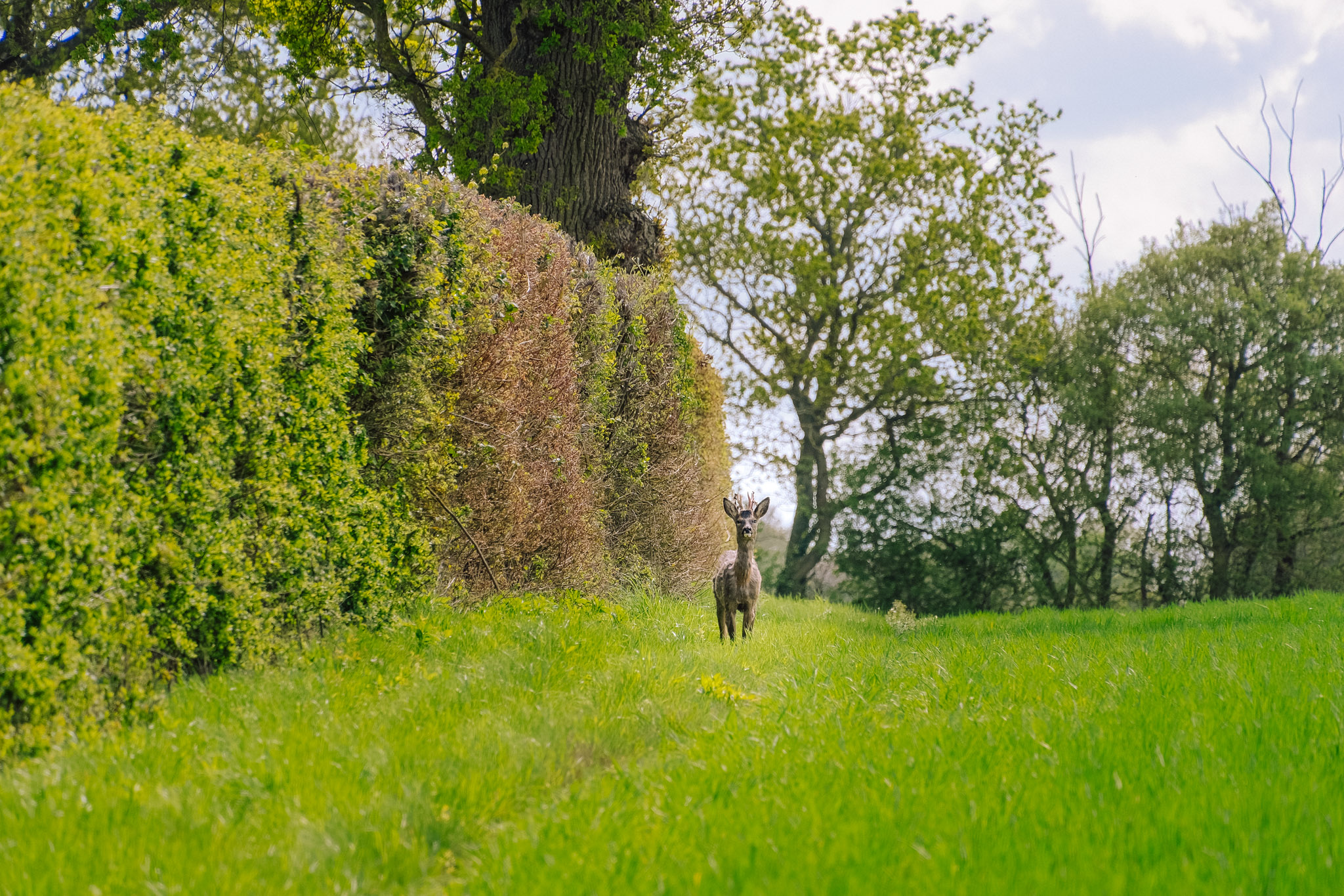 🦌 Leaving the woodland floral display behind, we navigated our way towards Brick Kiln Farm, popping out into the wide-open expanse of the fields. It was here that we had our very own David Attenborough moment. As we crossed the farmland, we spotted a beautiful young deer. We froze, it froze, and we shared a peaceful little staring contest until it clearly decided our walking gear wasn’t fashionable enough and bounded off into the distance.